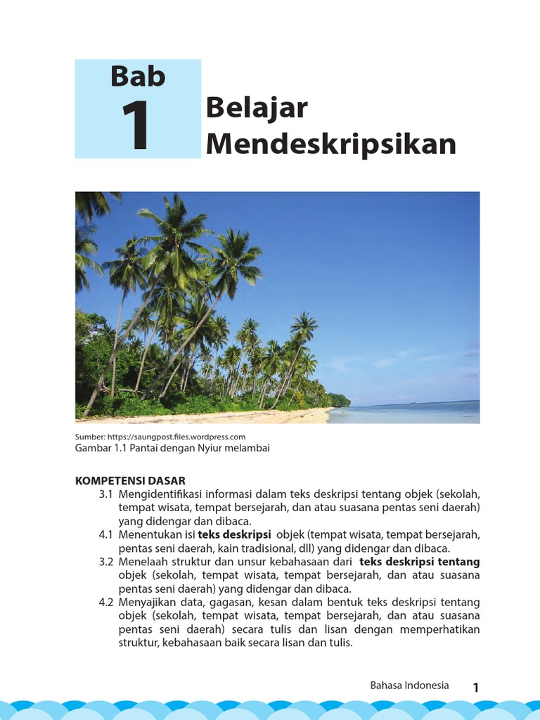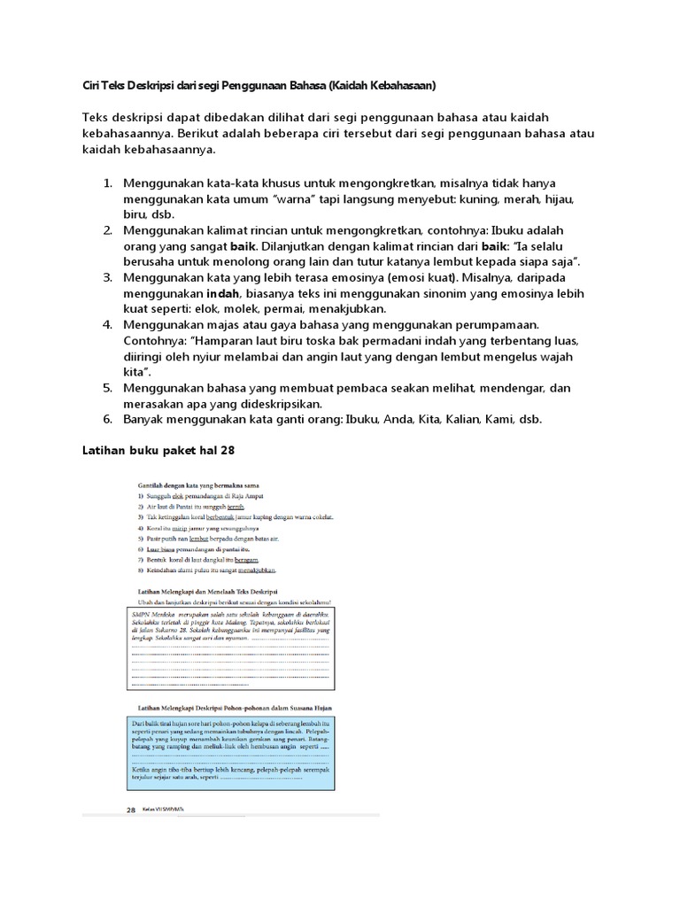 Laut bersih dan warna terumbu karangnya masih utuh. Bagaimana kebahasaan yang dipakai dalam penulisan teks deskripsi! Alasan lainnya, mungkin wanita itu terlalu polos, sehingga tidak terpikirkan olehnya untuk membersihkan bagian tersebut, hanya merasa kotor dan jijik saja. Klausa tersebut terdiri dari induk kalimat dan anak kalimat. Kata yang bercetak miring dalam kalimat tersebut bersinonim dengan kata dalam kalimat.